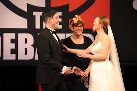 Pictured: (L) Tim in rented tux, on one knee, proposing to Dana in the closer of his debate, overseen by host Steve Patterson. (R) Tim in his tux & Dana in her wedding dress during their post-debate wedding ceremony with officiant Lara Rae.